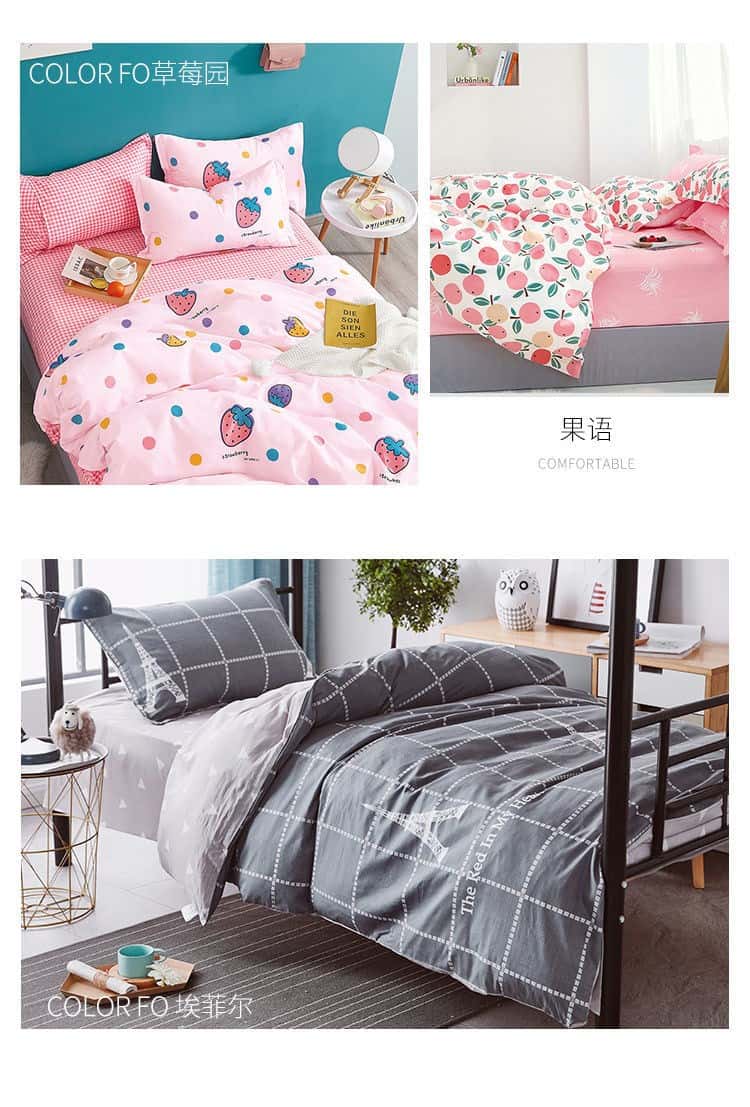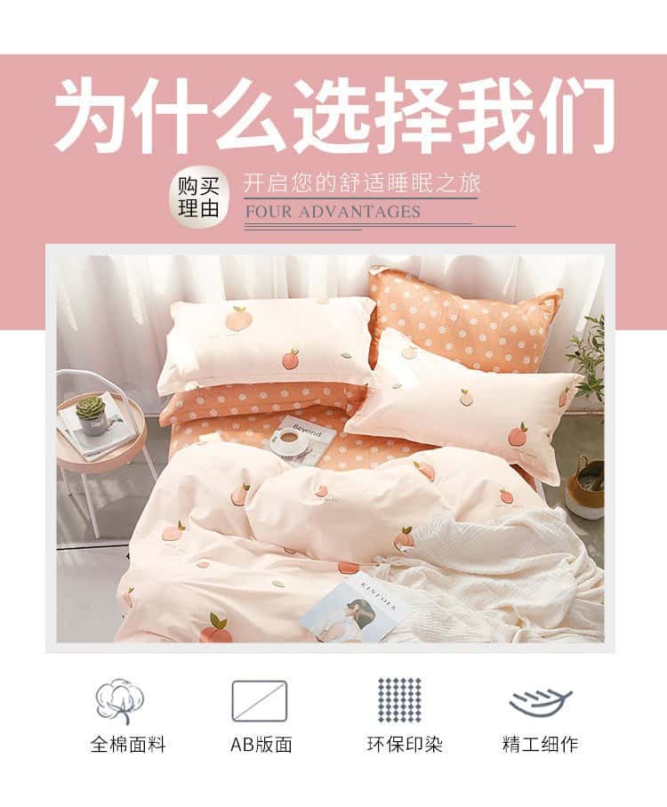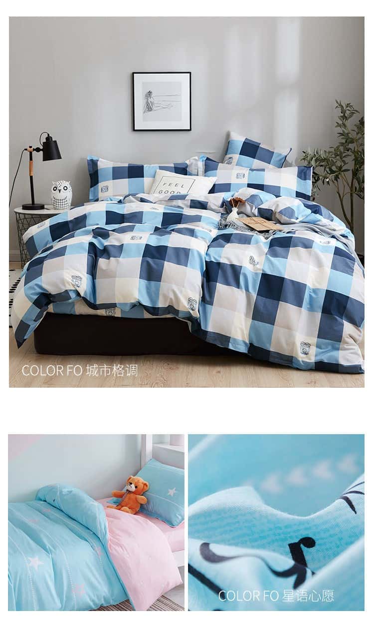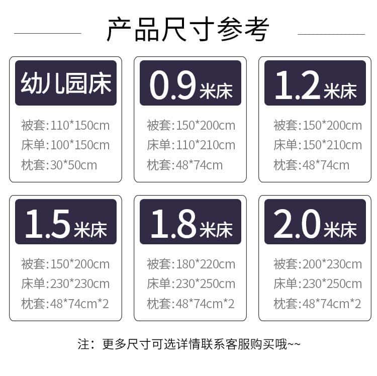 - 适用床尺寸: 0.9m三件套被套150*200cm 1.2m三件套被套150*200cm 1.5m四件套被套150*200cm 1.8m四件套被套180*220cm 2.0m四件套被套200*230cm 2.2m四件套被套220*240cm